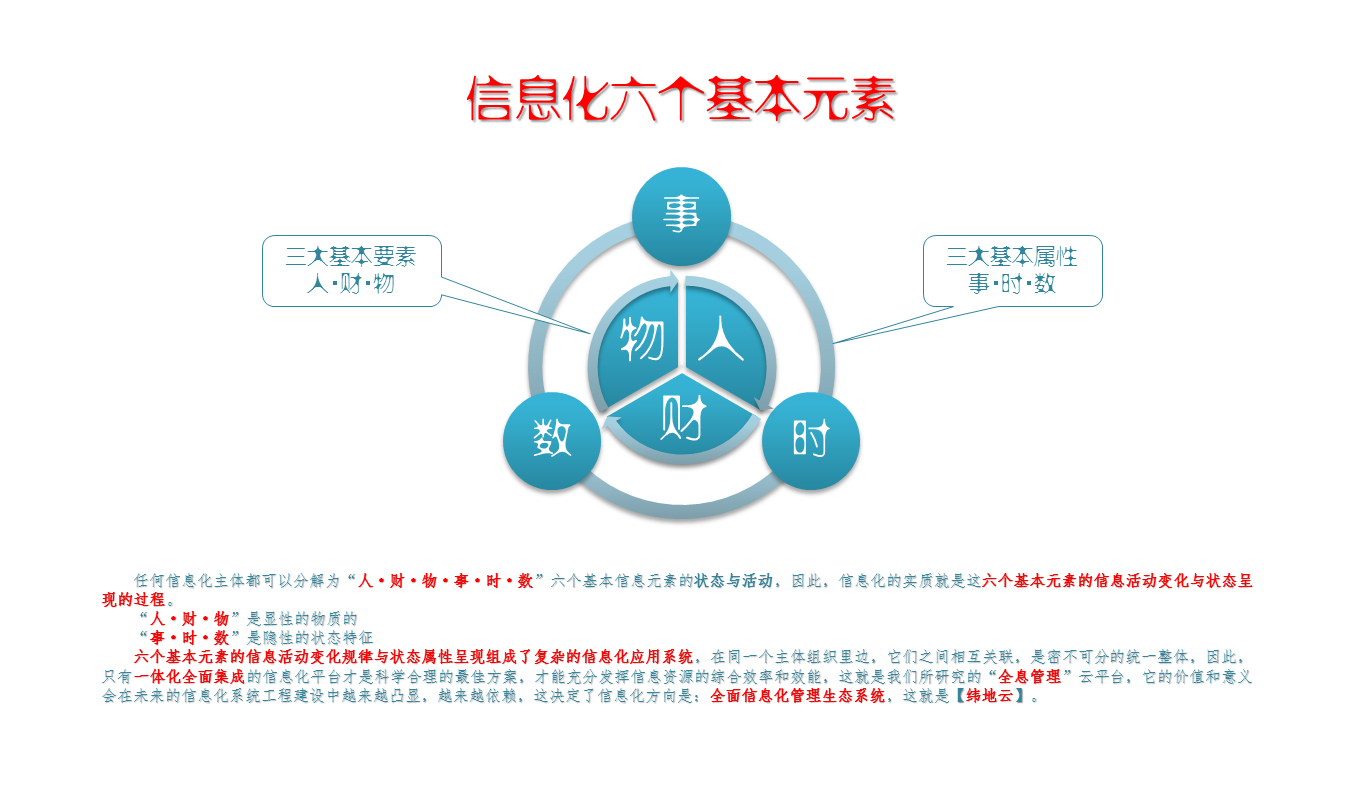 任何信息化主体都可以分解为“人·财·物·事·时·数”六个基本信息元素的状态与活动,因此,信息化的实质就是这六个基本元素的信息活动变化与状态呈现的过程。
